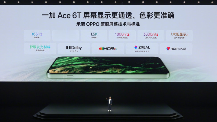 在很重要的显示方面,一加Ace6T采用6.83英寸护眼大直屏(1.5K),主打165Hz超高刷新率和游戏生态,还有更好用的超声波指纹识别。在触控方面,自研的雨水触控升级到2.0版本,还支持戴在手套操控屏幕,演示给线下用户绝对能让他们眼前一亮。前置1600万像素,后置5000万+800万双摄组合,优势是超清实况照片、柔光人像和复古胶片滤镜等等,对大部分用户来说够用了。