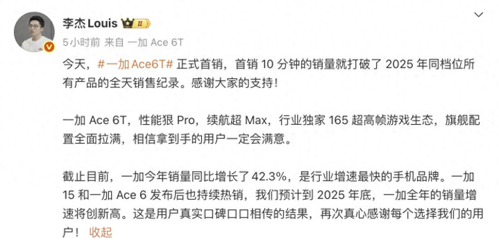 对于一加Ace6T的首销成绩,亓纪的想法是这样的:销量往往表达了普通消费者对该机的态度,毕竟超大电池搭配抗跌防水机身,还有不俗的性能和更低的价格,这样的产品销量好一些也在情理之中。如果你对续航有极致的追求,一加Ace6T可能是目前最优的选择,这或许就是它销量很不错的主要原因。
