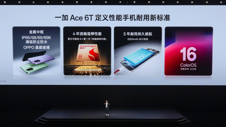 对于普通用户来说,电池足够大才是王道,而这也是一加Ace6T的核心卖点。除了8300毫安时电池以外,一加Ace6T还支持100W闪充和旁路充电,更重要的是机身能够做到8.1毫米和211克。至于耐用性方面,不仅有天穹架构和晶盾玻璃,还有IP66、IP68、IP69和IP69K满级防尘防水,在目前同价位机型中真的不多见。