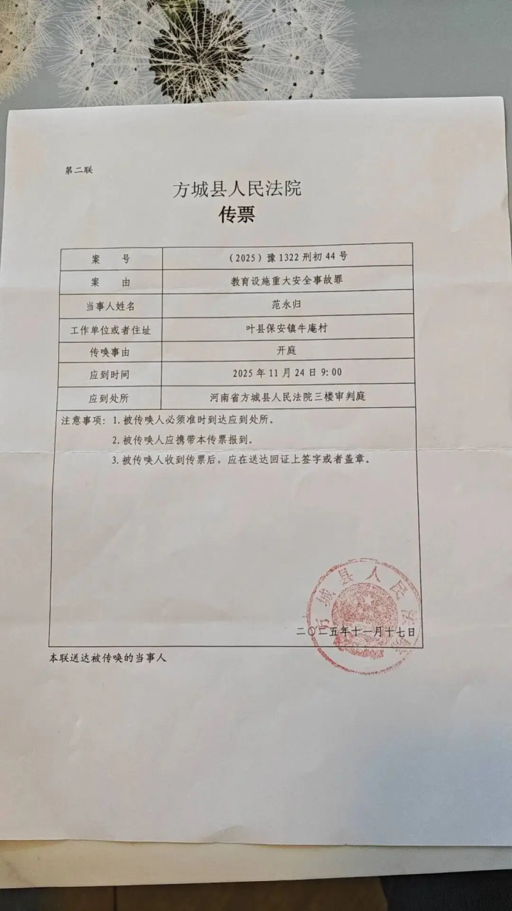 12月12日,潮新闻记者从范永归处得知,目前初步商定的开庭时间是在12月22日以后,“最早通过传票形式通知的是开庭时间是在10月29日,后来又改为11月24日,但是11月23日晚上10点多又接到通知称,方城县人民检察院在23日下午提交了新的证据,开庭时间延后。”范永归无法理解,他现在的诉求是,相关部门能向遇难者家属公布一份真正的书面调查结果。