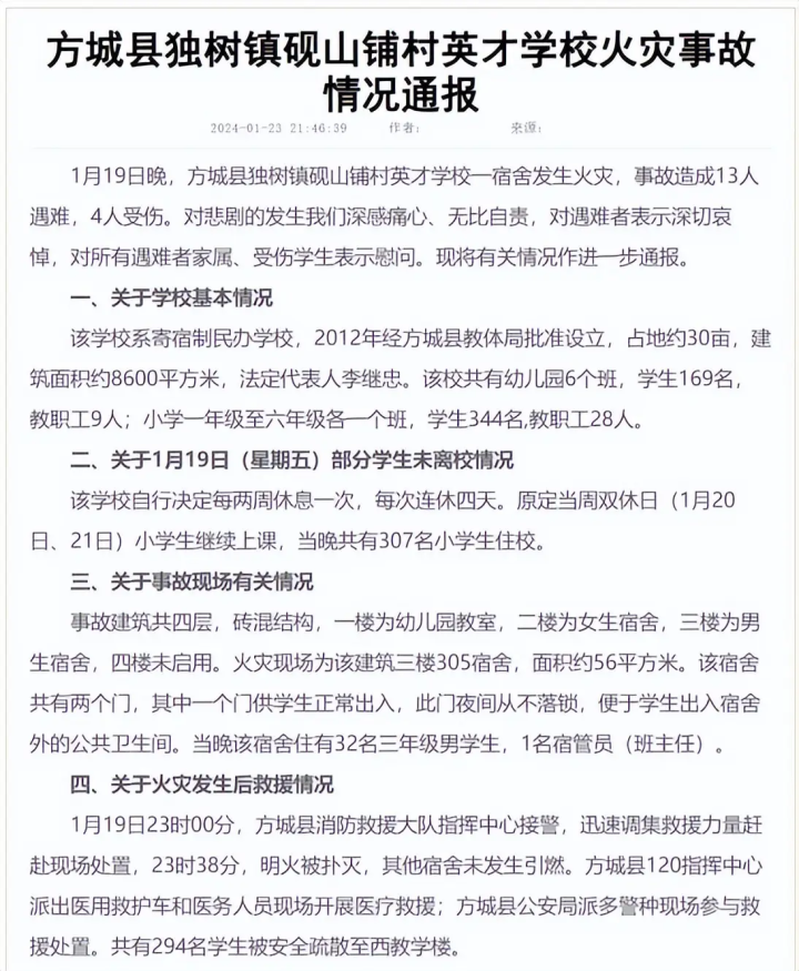 2024年1月19日,河南省南阳市方城县独树镇英才学校发生火灾事故,有13名学生遇难,遇难孩子平均年龄仅9岁,小南正是其中之一。