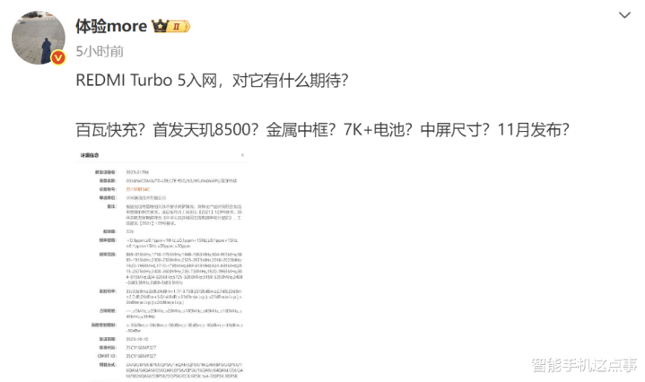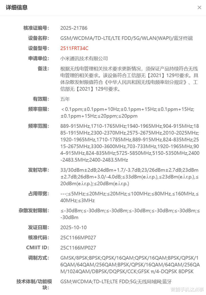 而说到中端机,近期REDMI Turbo 5已经备案,型号为2511FRT34C,这款备受期待的中端性能旗舰预计将在今年年内亮相,很可能会在11月与消费者正式见面。