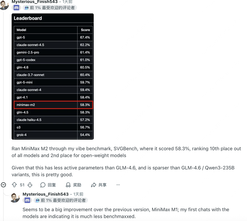 极致的智能水平、响应延迟与成本效率体验,让海外的AI开发者给予中国开源模型一致好评。知名平台LMarena第一时间发X,向开发者推荐M2模型测试; Reddit社区技术大V在基准测试中运行了MiniMax M2,“它获得了58.3%的分数,这算是相当不错的表现”;CoreViewHQ 联合创始人兼CTO Ivan Fioravant 表示,“MiniMax-M2 的表现相当出色!甚至比 Claude 4.1 Opus 还要好,即使在实际使用中也令人印象深刻”;更有海外个人开发者接入API进行了广泛测试,并在技术社区分享真实案例。