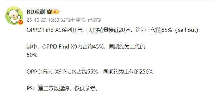 遗憾的是行业人士并没有给出OPPO Find X9系列开售一周的数据。我们只找到了开售三天的销量,这个此前已经给大家分享过。在此就不做点评了,等后续有开售半个月甚至是一个月的数据再来对比。不过从OPPO Find X9系列首售当天与OPPO Find X8系列是基本持平的,占大头的是OPPO Find X9 Pro,开售三天后约为上代的85%,同比是下降的。好的消息是OPPO Find X9 Pro的同比销量大幅度增长。
