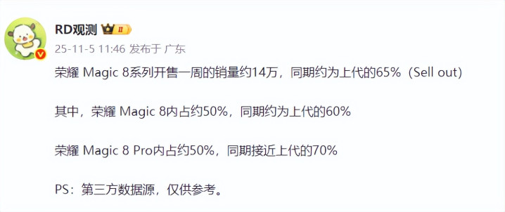 荣耀Magic8系列开售一周的销量约为14万台,同比约为荣耀Magic7系列的65%。其中荣耀Magic8占比约为50%,同比约为荣耀Magic7的60%,算下来销量为7万台。荣耀Magic8 Pro占比也是50%,同比接近荣耀Magic7 Pro的70%,算下来销量也是7万台。荣耀Magic8系列最令人没想到的是标准版与Pro版之间的销量占比竟然是一比一。