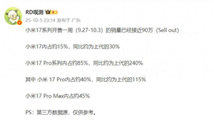 小米17系列开售一周整体激活量近90万台。其中小米17占比约为15%,同比为小米15的30%。大约销量为13.5万台。小米17 Pro系列占比约为85%,同比约为小米15 Pro的240%,算下来销量约为76.5万台。小米17 Pro占比约为40%,同比约为小米15 Pro的115%,大约销量为36万台。小米17 Pro Max占比约为45%,大致销量为40.5万台。