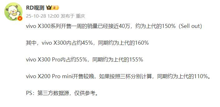 vivo X300系列开售一周的销量接近40万台。约为上代两款(不算Pro mini)的150%。其中vivo X300占比约为45%,同期为vivo X200的160%,大致销量为18万台。vivo X300 Pro占比约为55%,同比约为上代的155%,算下来销量约为22万台。如果对比vivo X200系列三款机型,vivo X300系列开售一周约为110%,就是提升了10%。